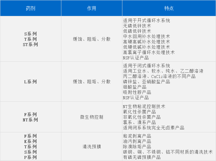 药剂涵括清洗、预膜药剂、缓蚀阻垢剂、氧化杀菌剂、非氧化杀菌剂、粘泥剥离剂、在线清洗剂等全流程药品。